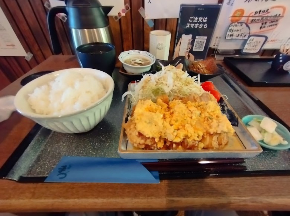 おすすめの一品は「チキン南蛮」。揚げたての鶏もも肉に、たっぷりの自家製タルタルソースがとろりとかかる。衣はサクサク、中はジューシー。甘酢の酸味がほどよく効いて、重たくならない味わいに仕上がっている。タルタルには刻み卵と玉ねぎが惜しみなく使われ、どこか懐かしい洋食屋の味を思わせる。定食には小鉢と味噌汁、そして大盛り無料の白ごはんが付く。ふっくら炊き上げたごはんは、どんなおかずとも相性抜群で、つい箸が止まらなくなる。