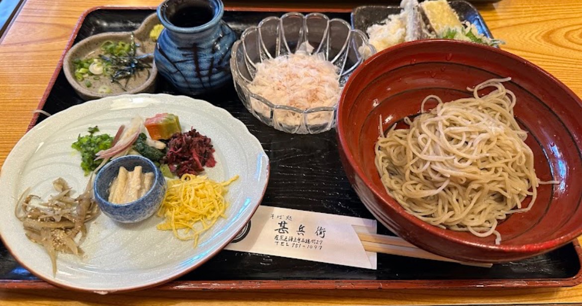 京都・銀閣寺のほど近く、左京区浄土寺石橋町の静かな通りに佇む「そば処 甚兵衛」。石畳の道を進むと、木の暖簾がやさしく揺れ、どこか懐かしい和の趣が漂う。観光客にも地元の常連にも愛される、京の蕎麦処だ。