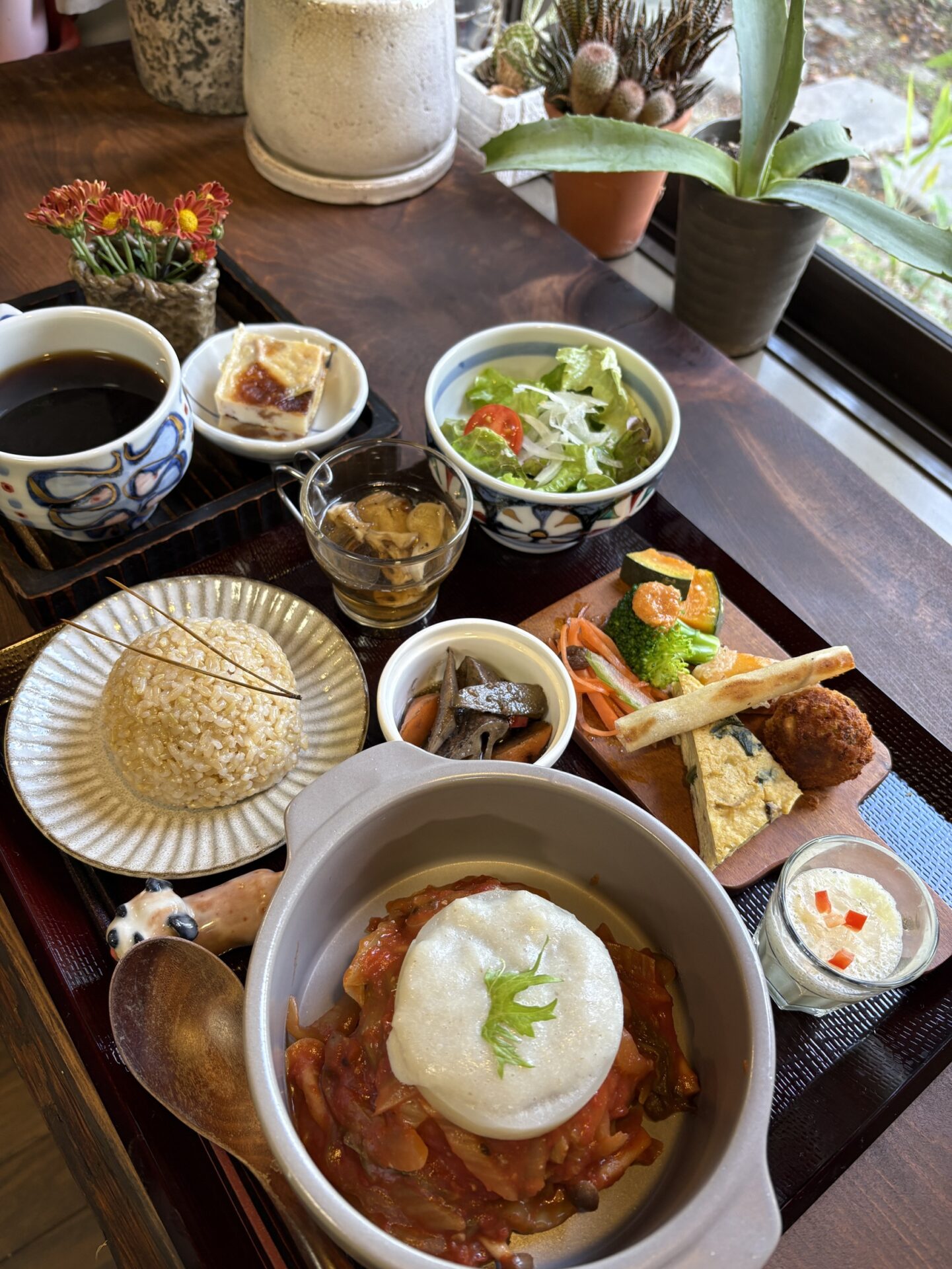 店内は、木の温もりを感じる落ち着いた空間。大きな窓から差し込む自然光や、季節の移ろいを感じられる景色が、食事の時間をより豊かなものにしてくれます。一人で静かに過ごしたい日にも、家族や友人と語らうひとときにも自然と馴染む、懐の深さを持った空間です。