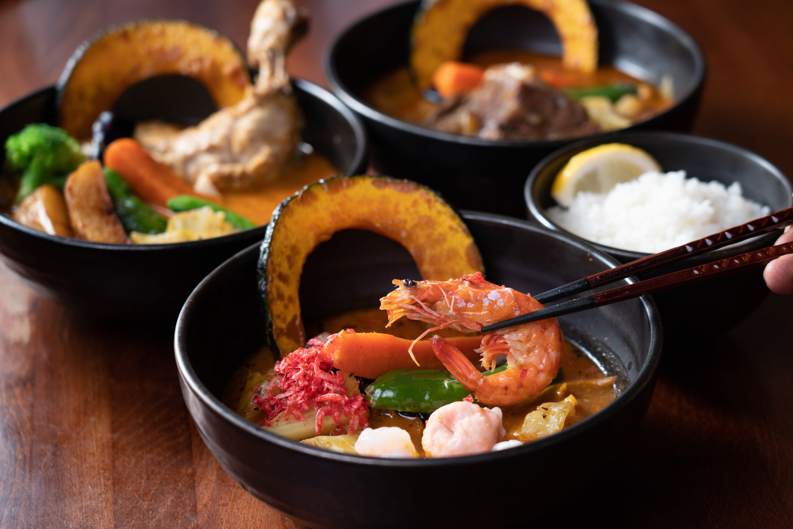 奥芝商店の最大の特徴は、「自分だけの一杯」を楽しめるスープカレー。その核となるのが、看板でもある【エビスープ】です。甘エビ頭を数千匹単位で使用し、絶妙な時間で旨味を引き出した濃厚な出汁がベース。海老の香りとコクが口いっぱいに広がりながらも、後味は驚くほど軽やかで、最後の一口まで飽きずに楽しめる仕上がりです。他にも立川限定【薬膳チキンスープ】もハマる人が続出中!?定番の【チキンスープ】もあります♪