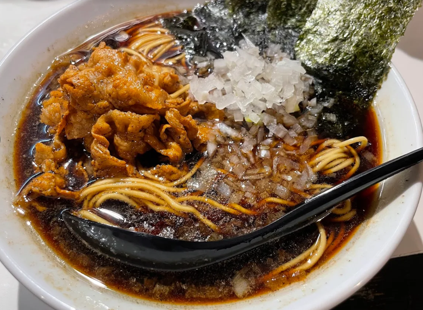 この店の看板商品「大島ブラック」は、他ではなかなか出会えない存在感を放つ。最大の特徴は、名前の通り真っ黒なスープだ。見た目のインパクトは強烈だが、単なる話題性に終わらないのがこの一杯。味わいはしっかり濃いめでありながら、ただ塩辛いわけではなく、奥行きのある旨味が舌に残る。店主は「濃いけれど、最後まで飲めること」を常に意識しているという。