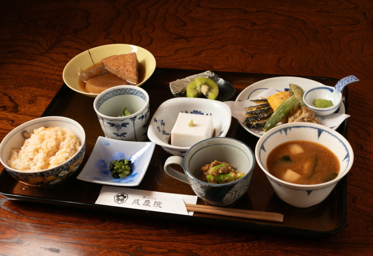 おすすめメニューは、成慶院の想いと技が詰まった「精進御膳」。季節ごとに内容が変わり、旬の野菜を中心に、胡麻豆腐や煮物、揚げ物、和え物などが美しく盛り付けられる。彩り豊かな膳は、まるで一幅の絵画のようで、目でも楽しませてくれる。ひと口ごとに野菜の甘みや旨みがじんわりと広がり、食べ進めるほどに心と身体が整っていくような感覚を覚える。精進料理に馴染みのない人でも、満足感のある味わいとボリュームに驚かされるはずだ。
